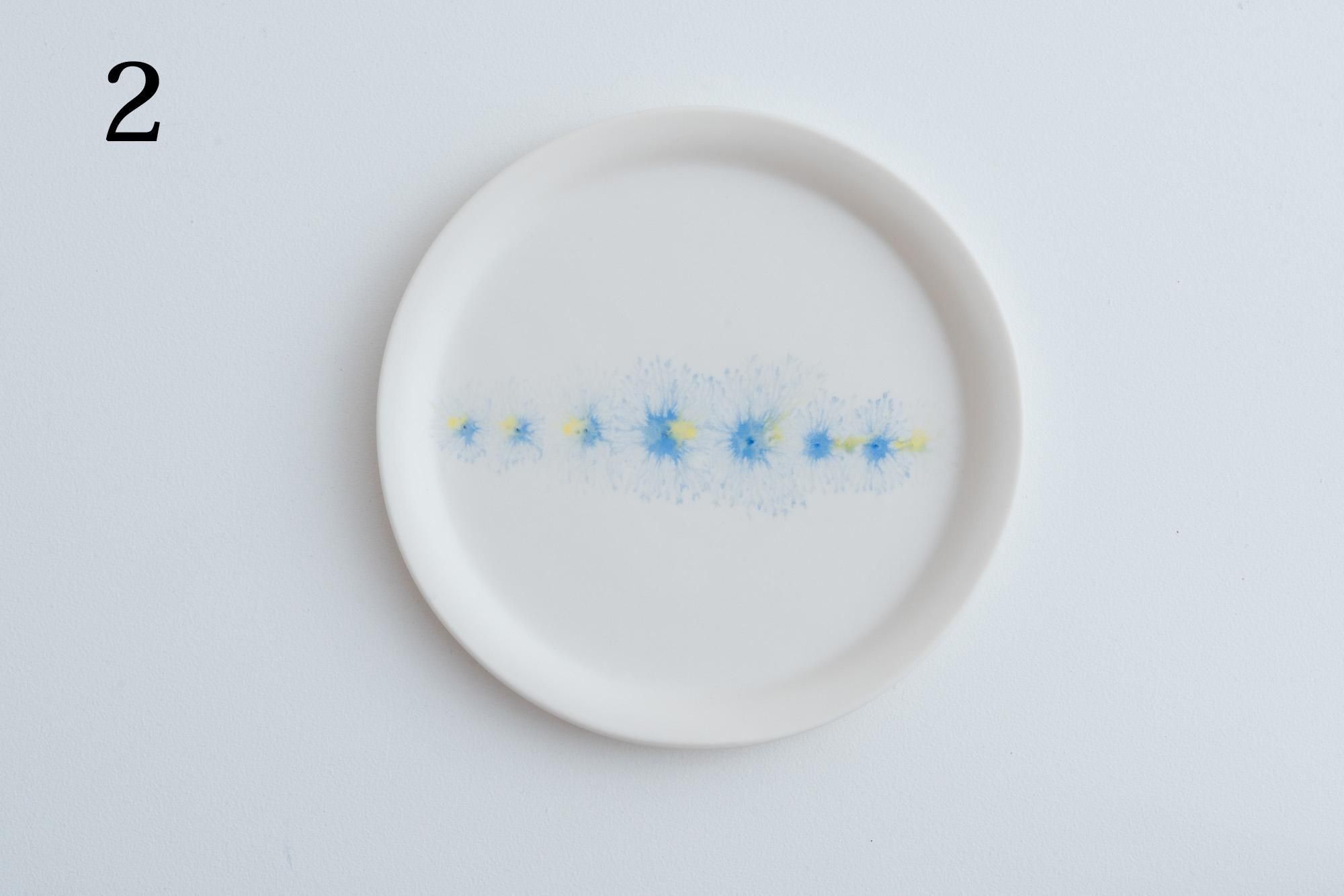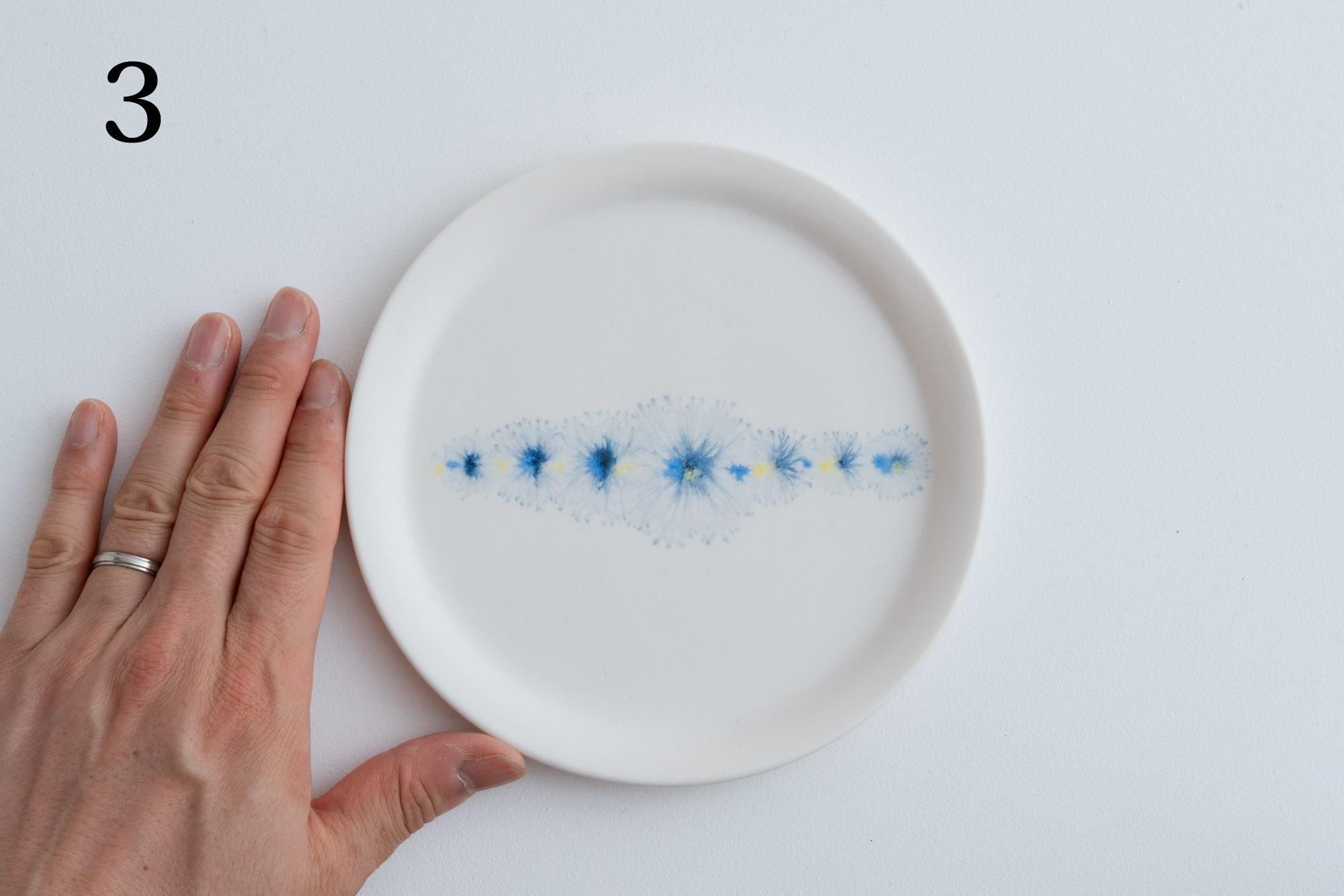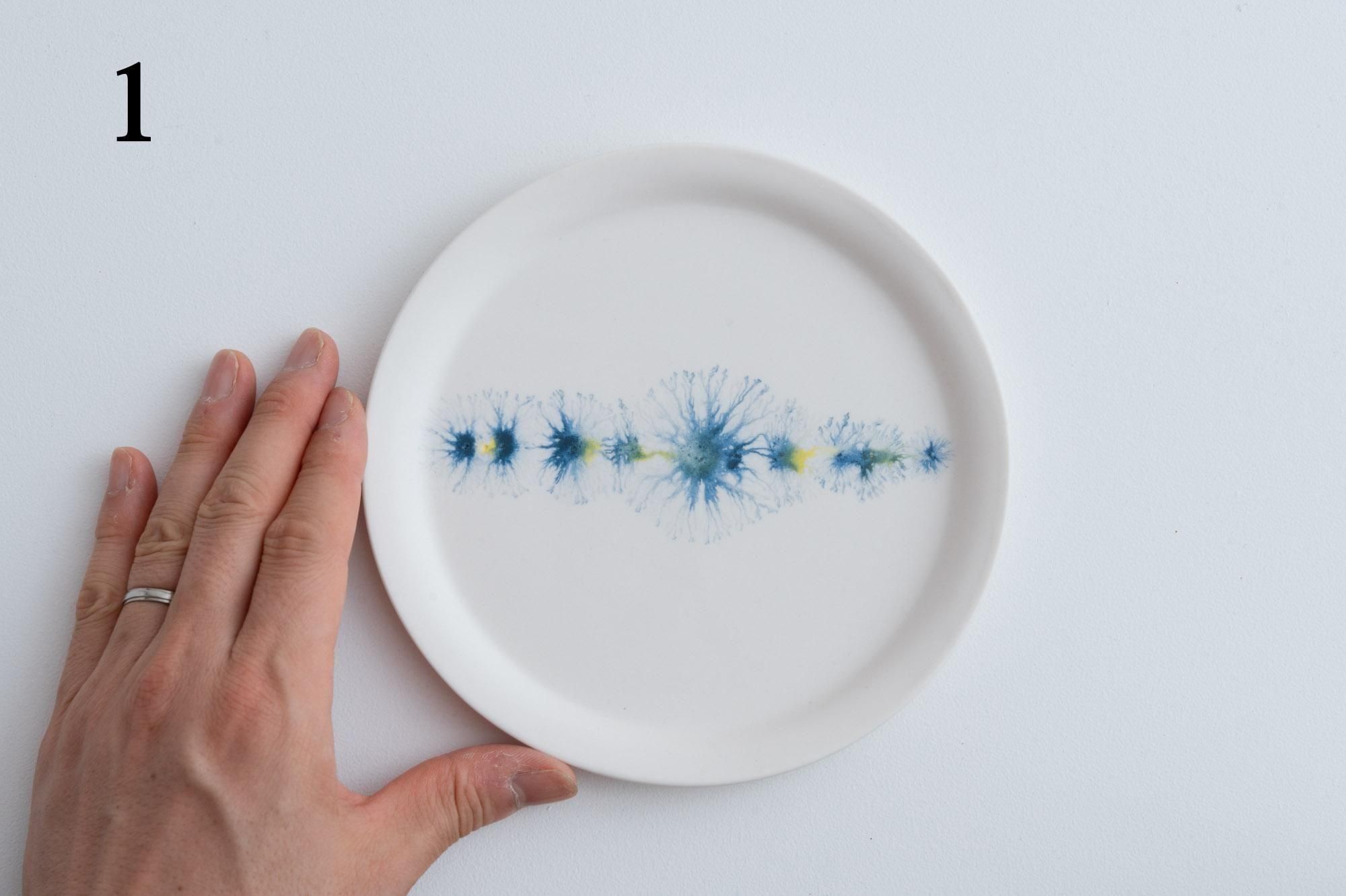 元々のモカウェアは「陶器」の手法であり、化粧土をかけてそれが乾く前に色を落とすことで色が樹氷のような模様として広がることを利用した描画の手法です。
