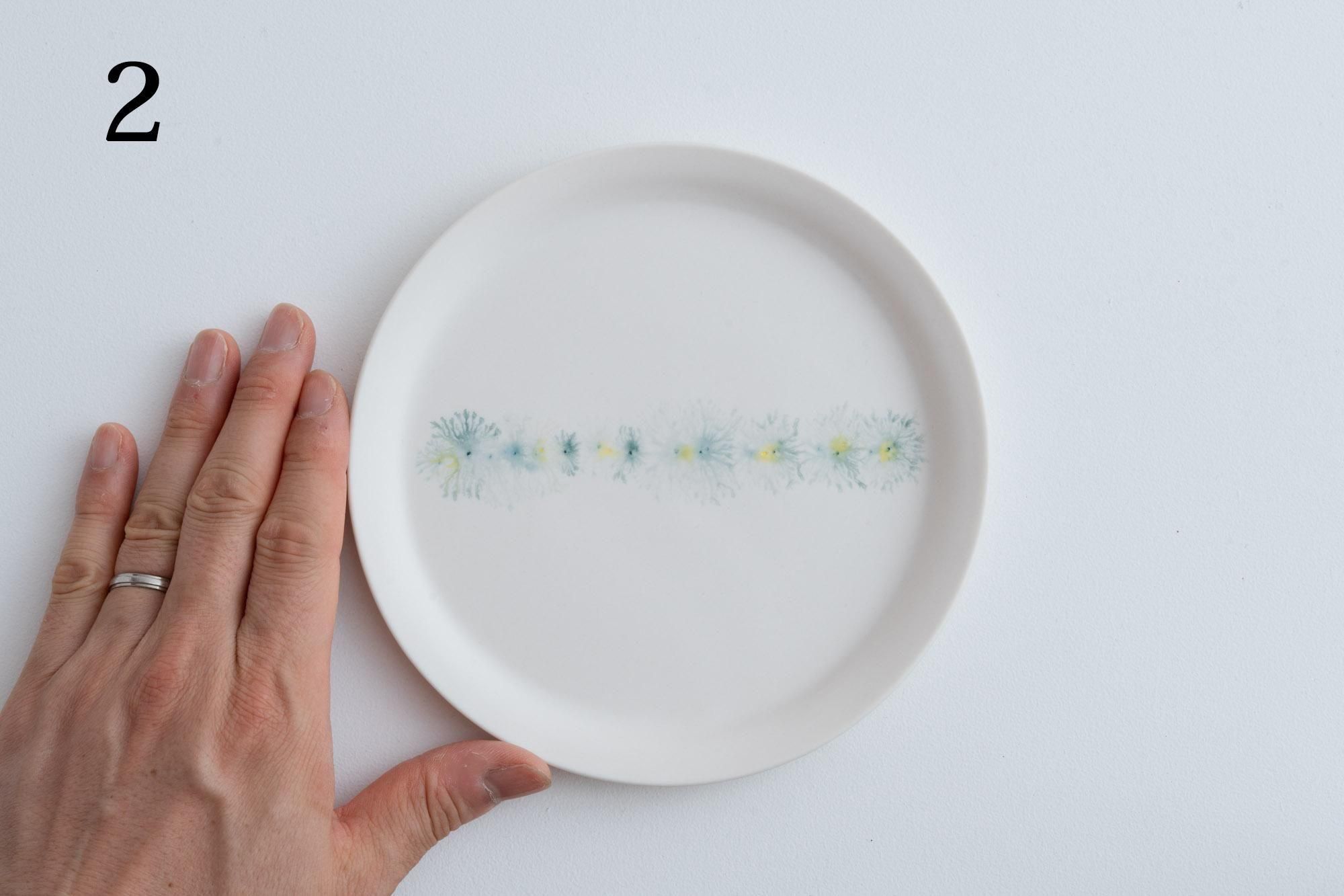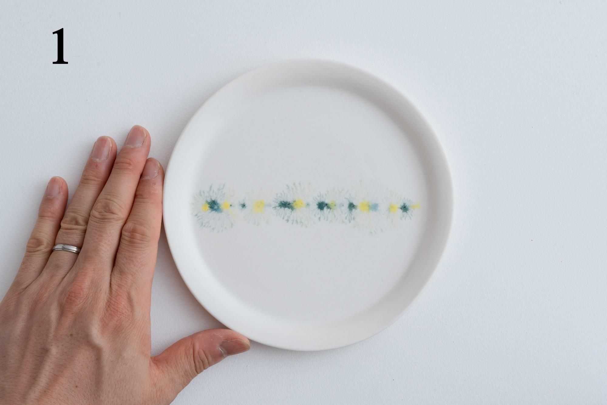 元々のモカウェアは「陶器」の手法であり、化粧土をかけてそれが乾く前に色を落とすことで色が樹氷のような模様として広がることを利用した描画の手法です。
