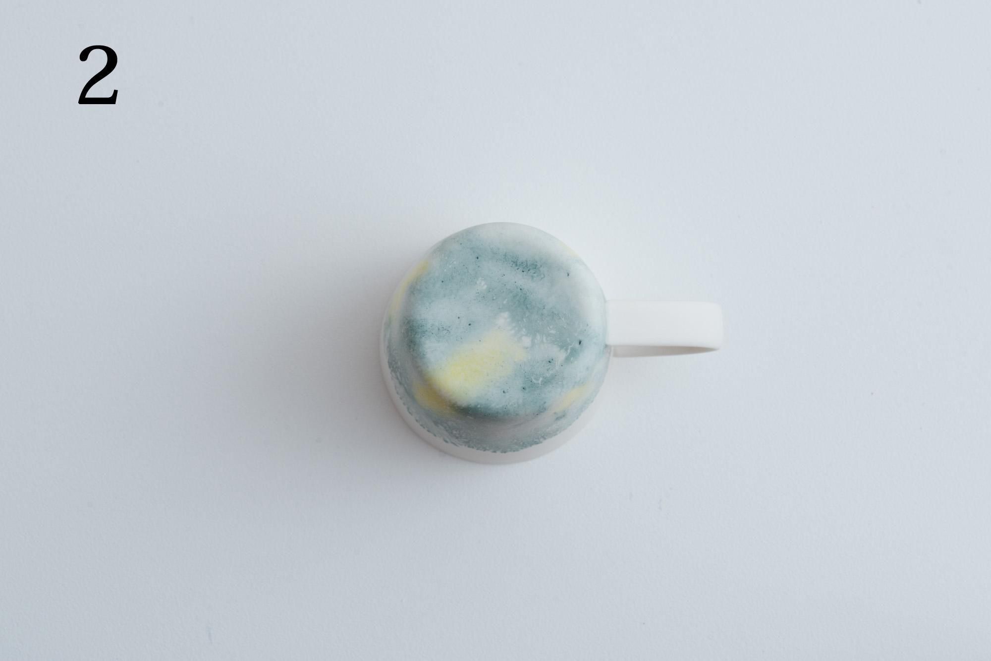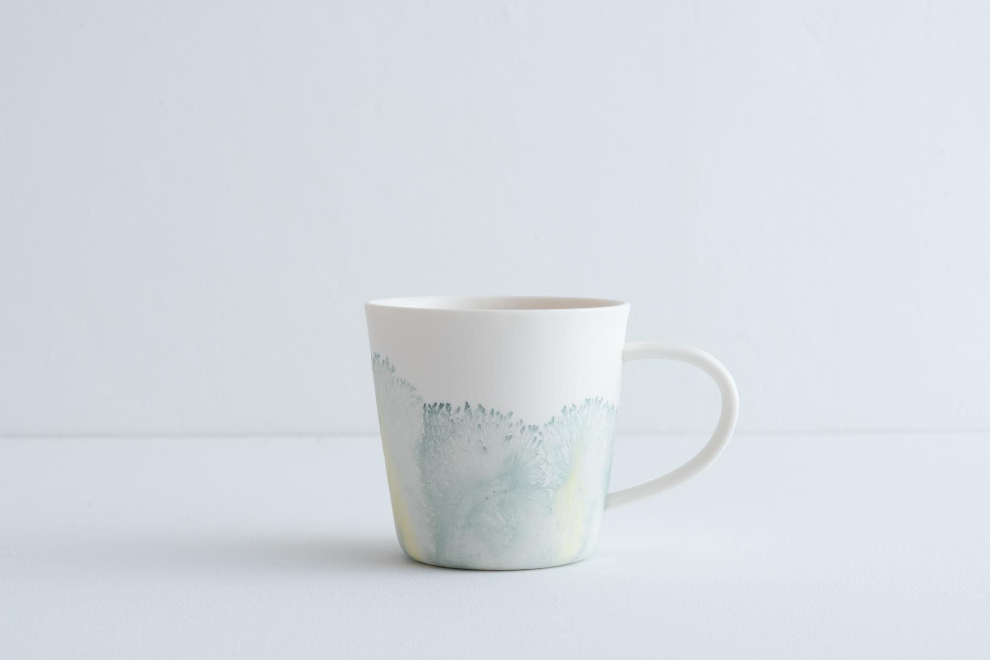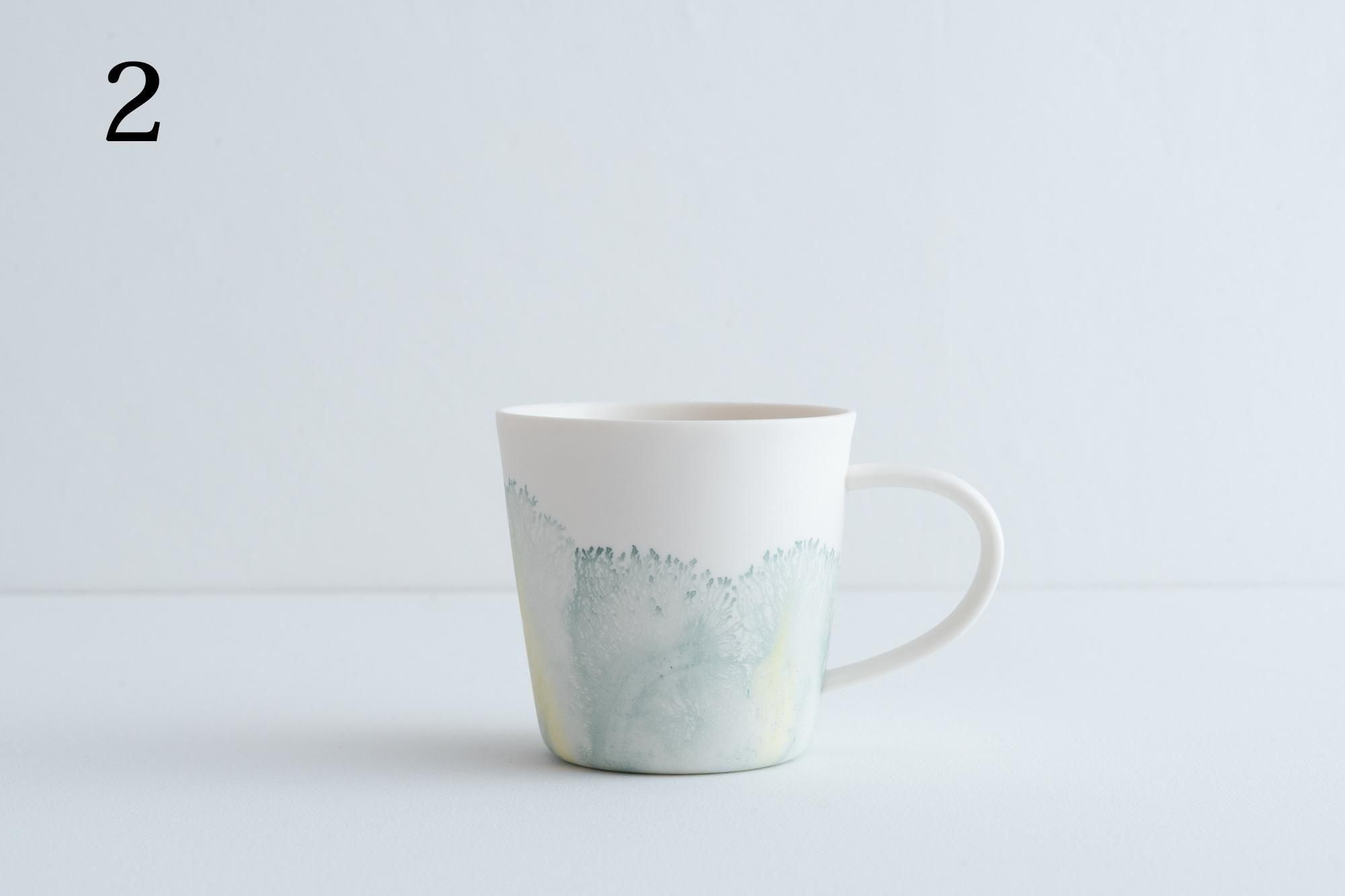 元々のモカウェアは「陶器」の手法であり、化粧土をかけてそれが乾く前に色を落とすことで色が樹氷のような模様として広がることを利用した描画の手法です。