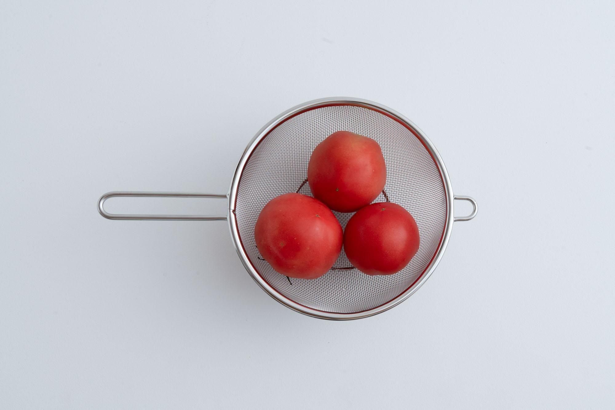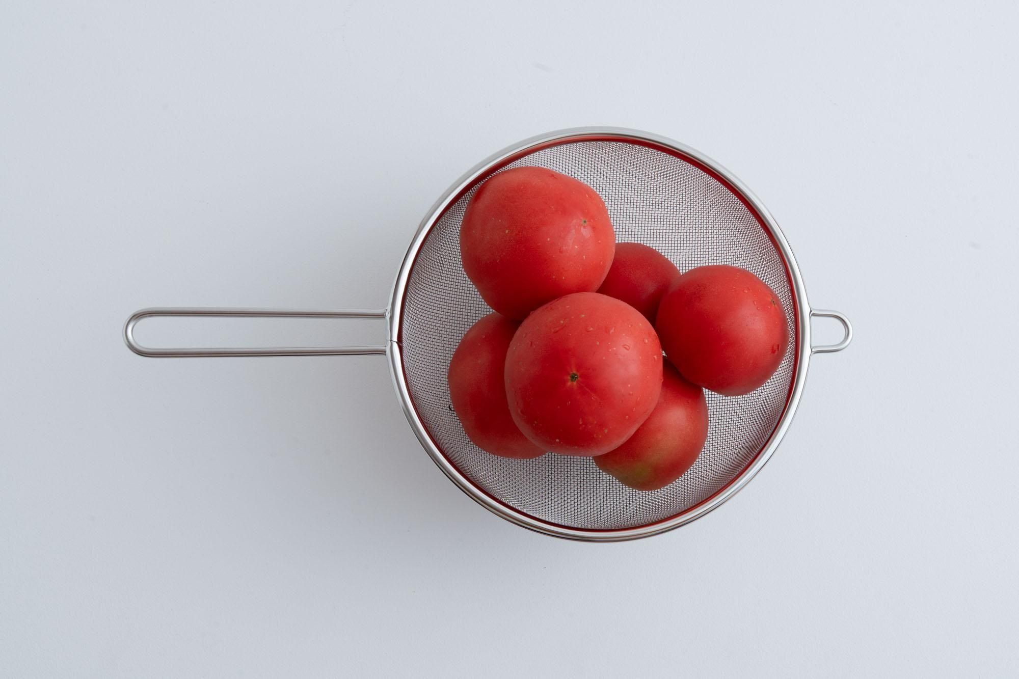 200mmサイズなら中玉トマトが6個くらい入る十分な大きさ。麺の茹で上げもこれでいけます。