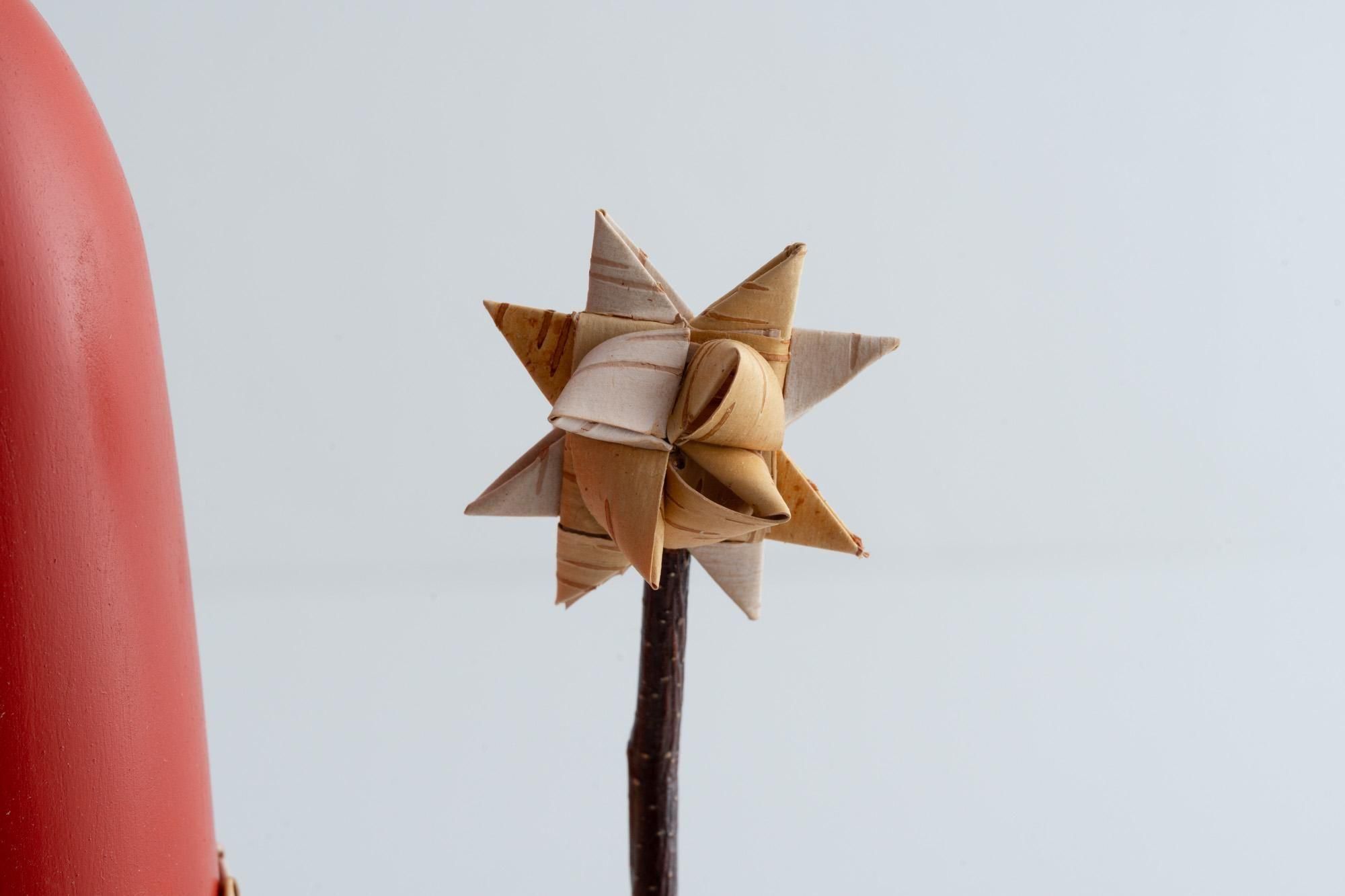この杖の先についている「星」も、頭のリングと同様白樺の皮を編んで作られています。