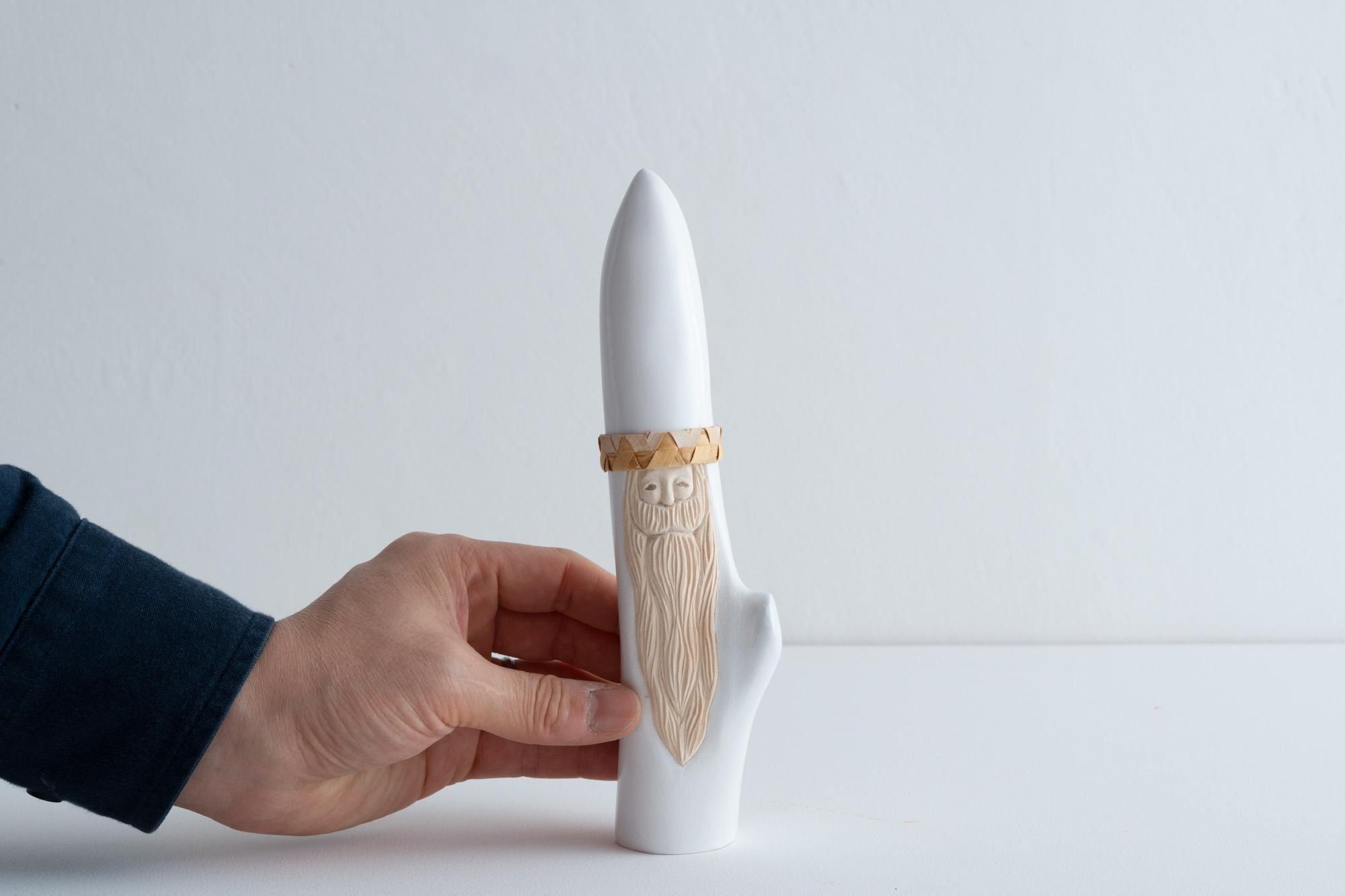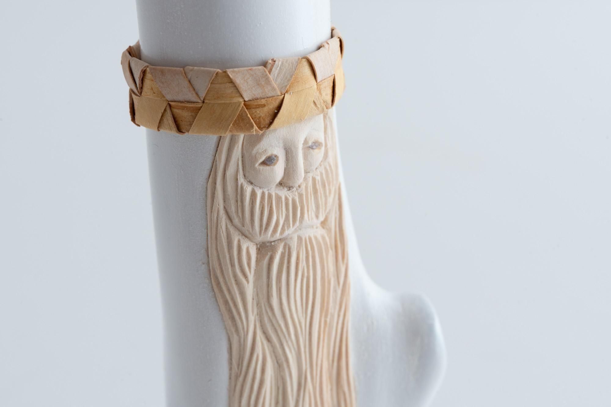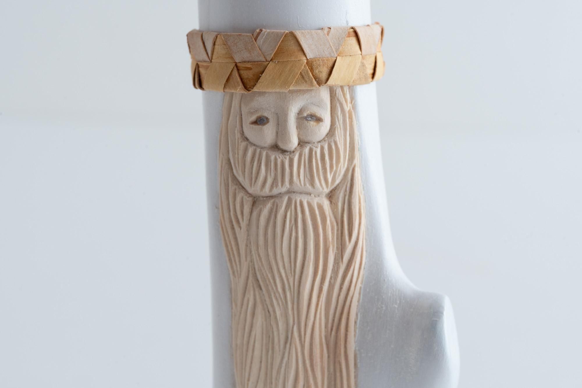 頭にかぶっているリングは、一つ一つサンタのサイズに合わせて白樺の皮を編んだもの(写真は別の白樺サンタです)。