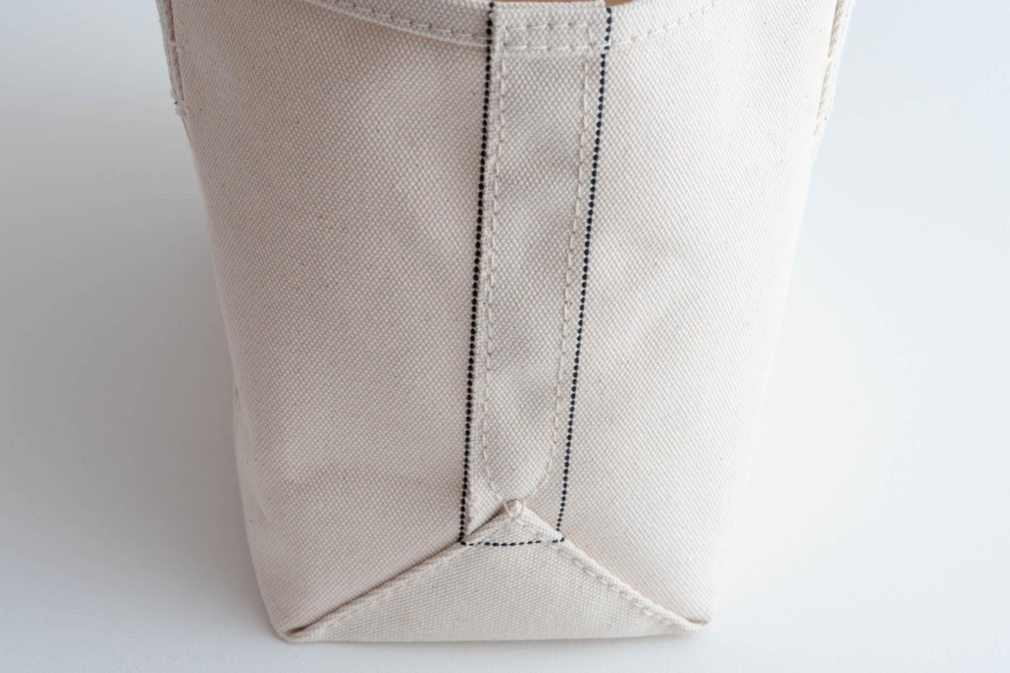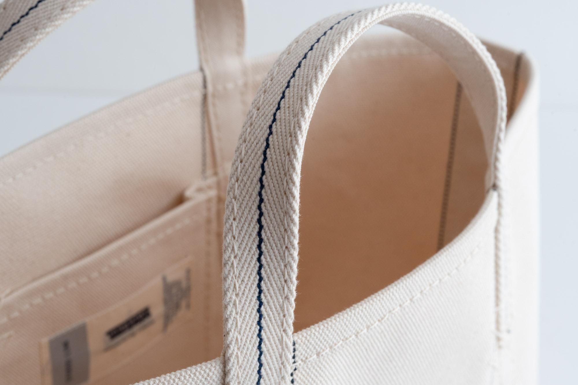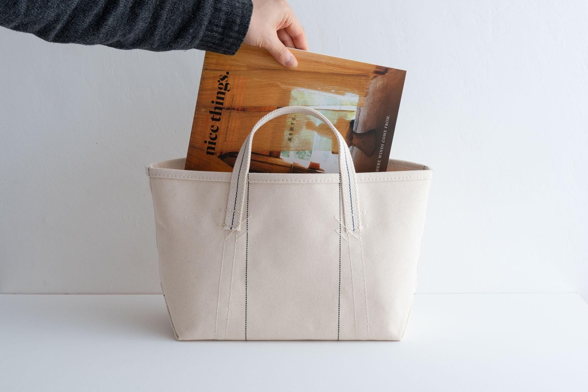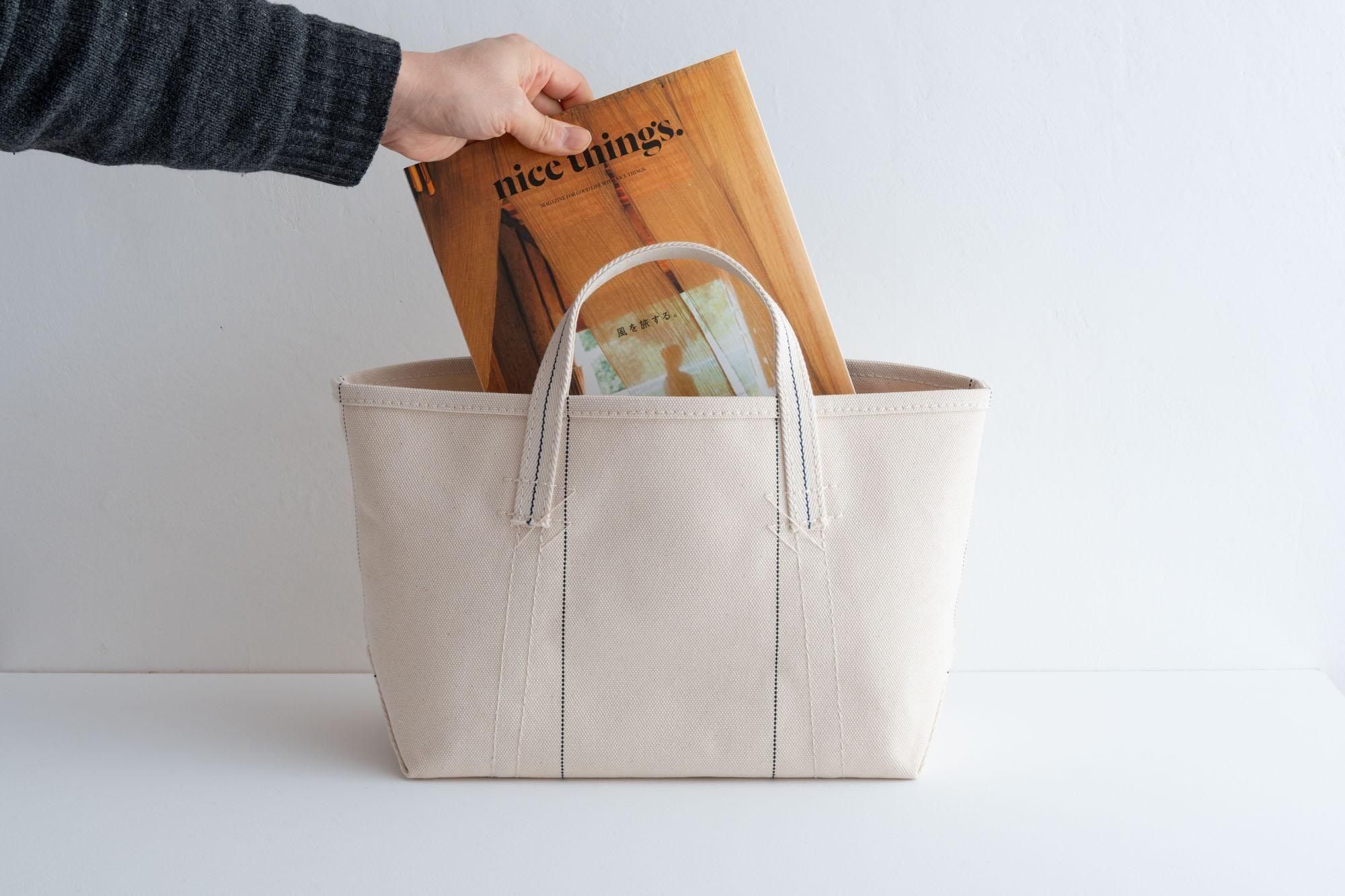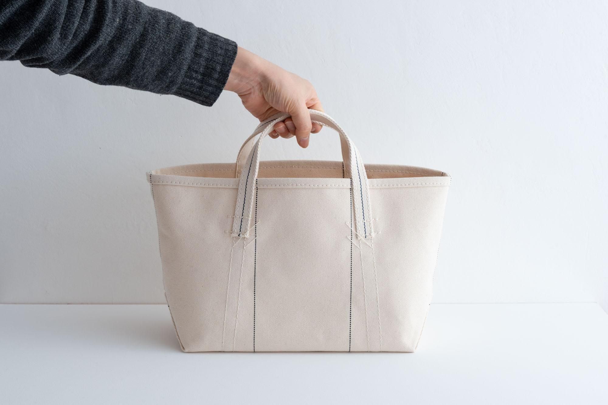 4号という厚みのある特注の帆布を使い(ちなみに号数が小さくなるほど厚みがあります)、たっぷりと入る容量があり、そしてショートハンドル。