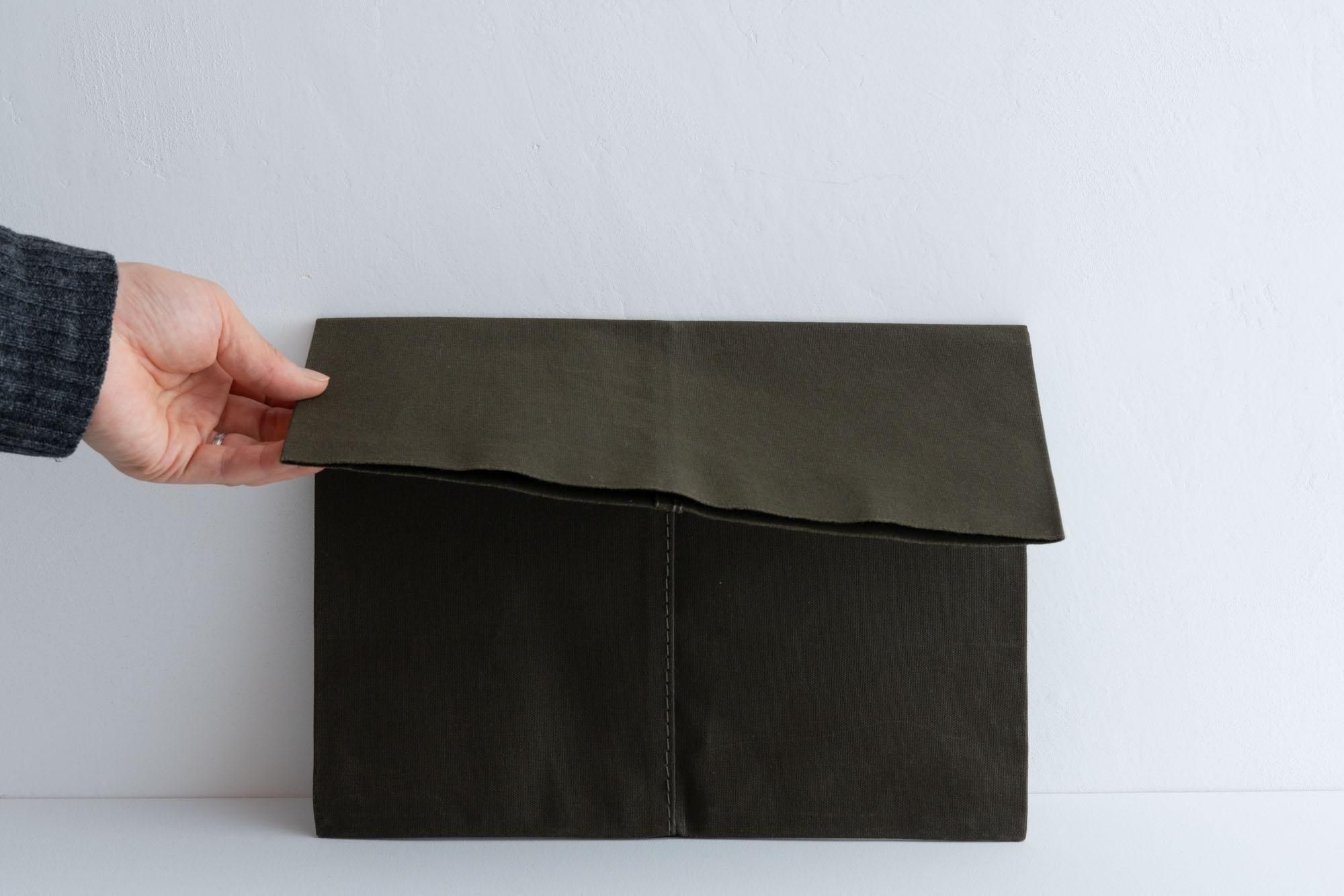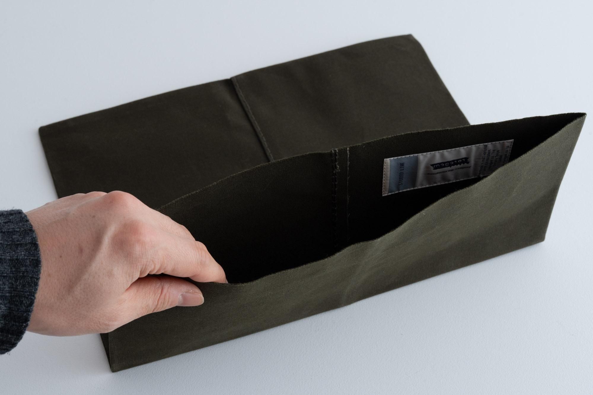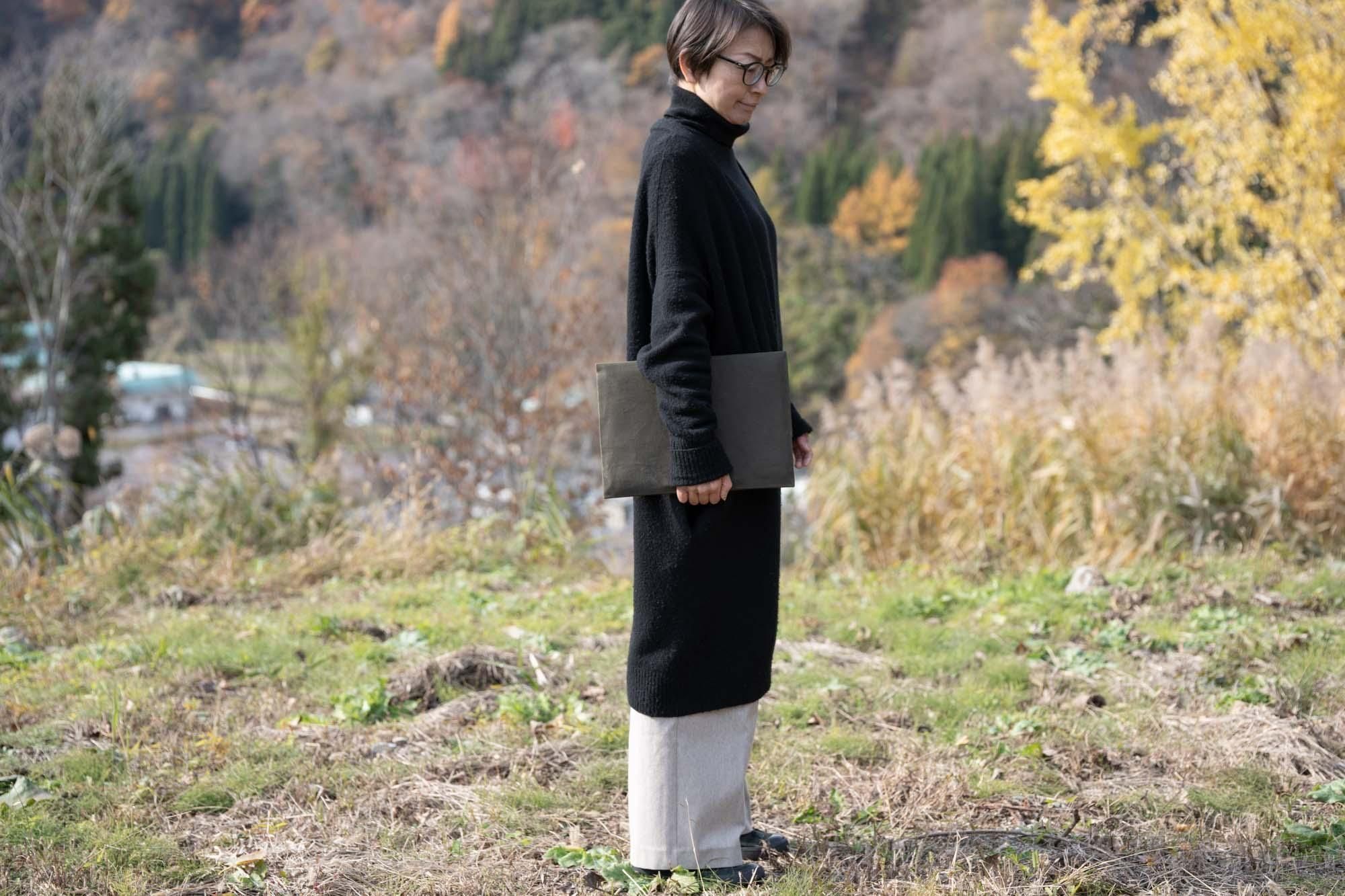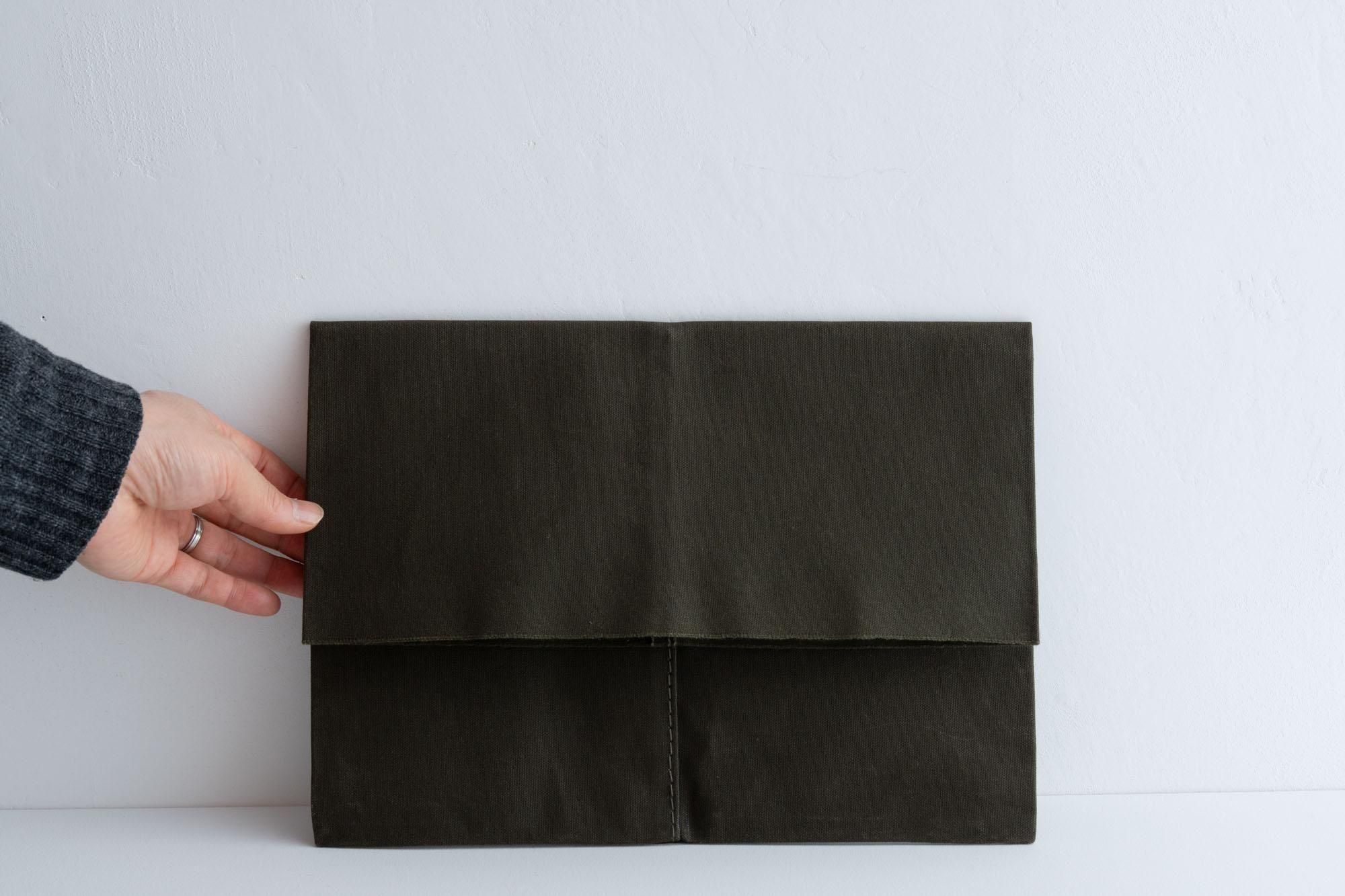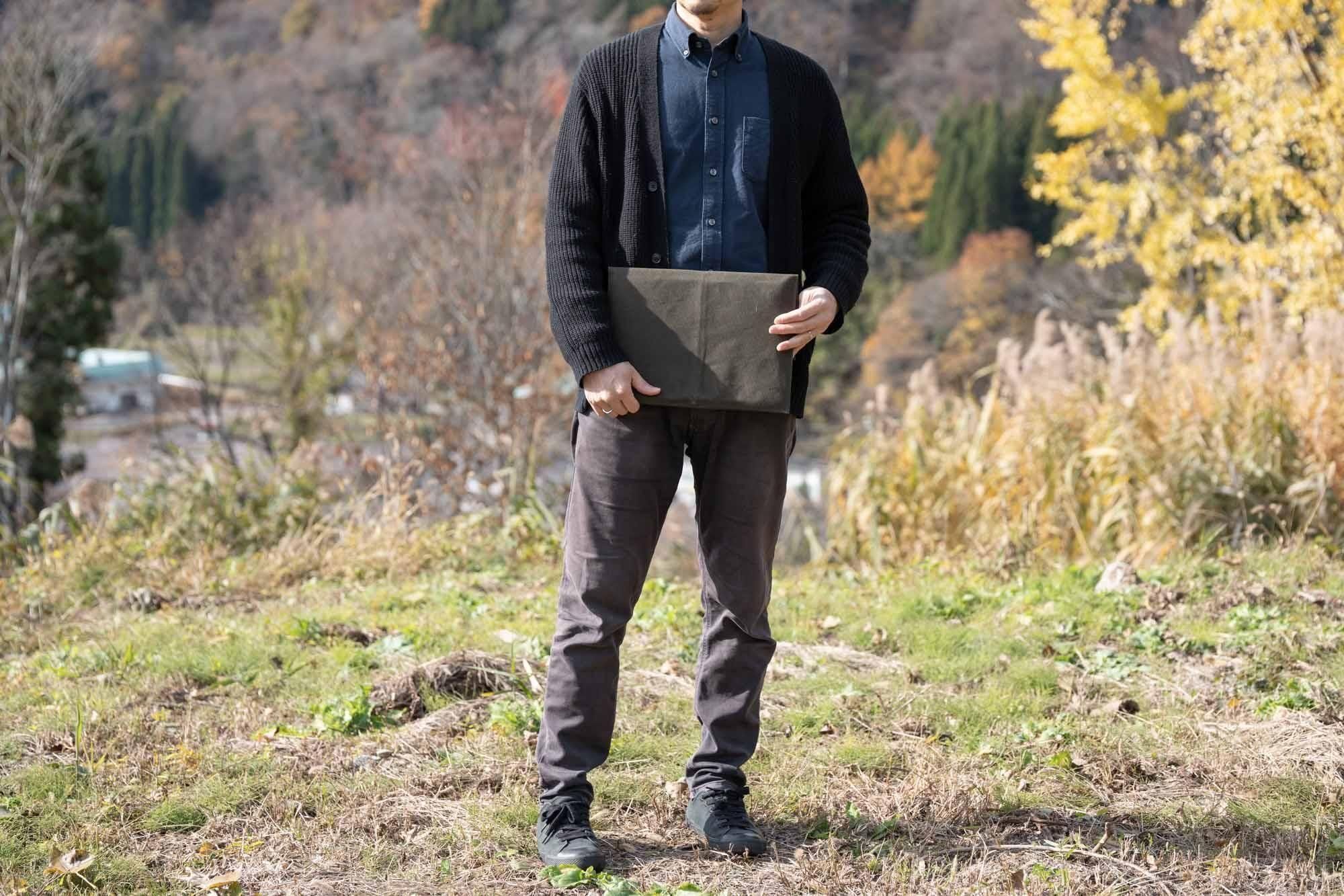 カバンの中で書類やパソコンなどを守るための「バッグインバッグ」として使うことを想定して作られていますが、もちろんクラッチバッグのように持ち歩く用に使うのもいいと思います。